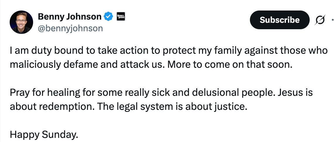 — Discovery will destroy your career beyond any possibility of redemption, Benny, which was never my intention and never in my heart because I believe that family is making you a better man, as I think it did Charlie Kirk, but this will be the inevitable result of your actions. I just want you to be honest because I believe that’s important and I believe that it is in the public interest to report on people who present one way and act another.