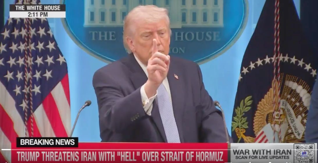 We surely can’t diminish the clear threat of nuclear destruction that Trump has made, posting this morning that a “whole civilization will be wiped out tonight” if Iran doesn’t accept his “deal.” This followed his deranged 1.5 hour press conference yesterday that showed how much of a lunatic he’s become, ending with “We want Greenland.”