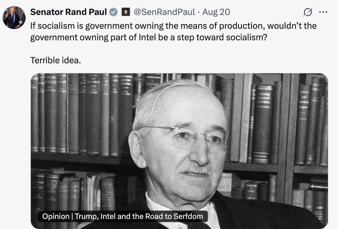 Republican Senator Rand Paul shared the piece on X, with the comment: “If socialism is government owning the means of production, wouldn’t the government owning part of Intel be a step toward socialism? Terrible idea.”