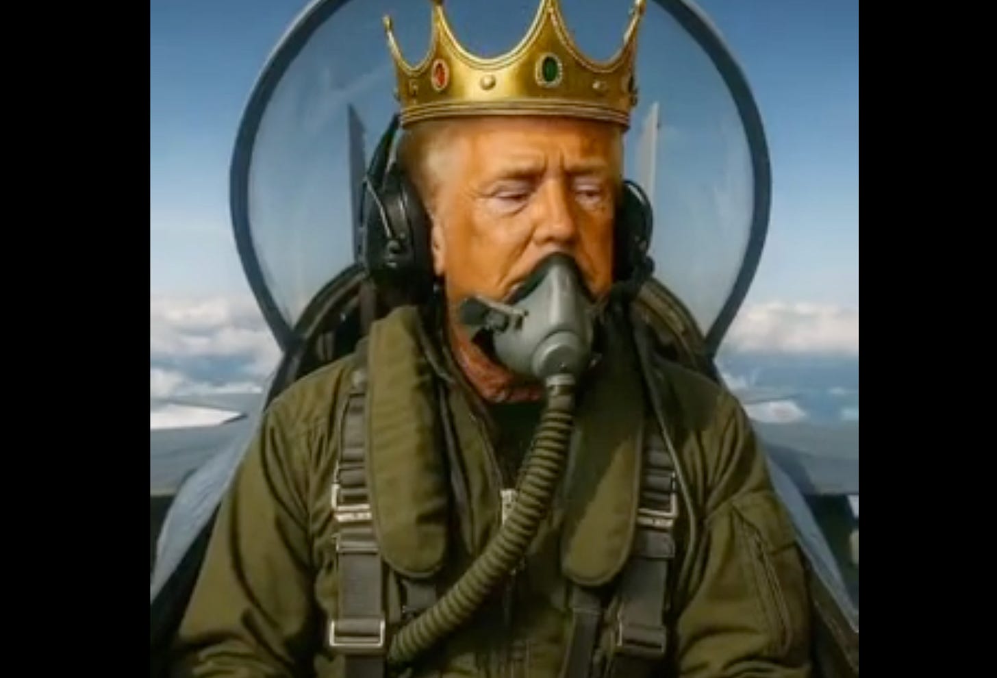 Trump’s response was even more juvenile—and showed how much the protests had gotten to him. He shared an AI video of himself in a crown, piloting a bomber over the protests, looking like he’s sitting on the, um, throne—and then dumping shit all over the protesters. Some in the media idiotically called it “brown liquid” or “sludge,” but we know what it was. And it was another promotion of violence—dropping anything onto people from a plane is violent for sure—and our media once again has normalized it, even minimized it.