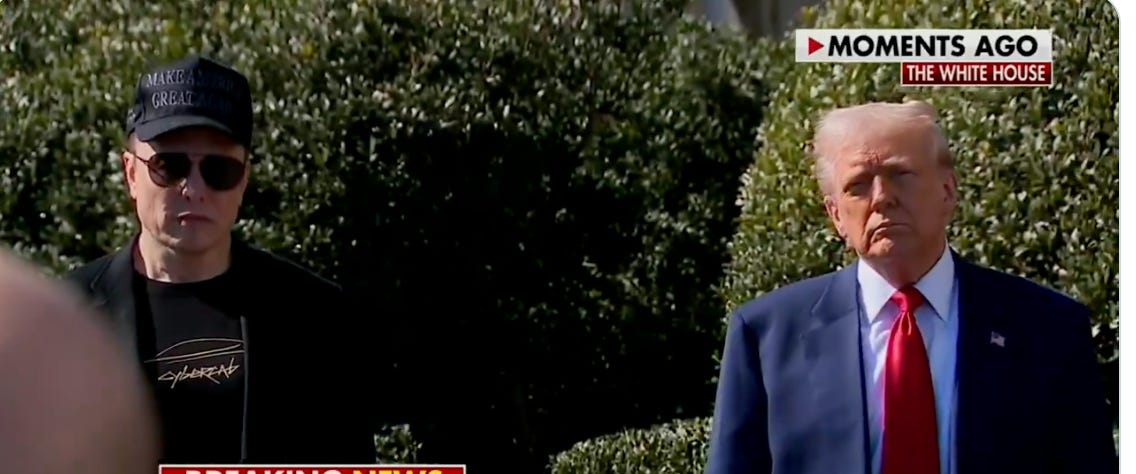 Musk, seeing Tesla sales plummeting as protests against him escalate, turned to Trump, a natural car salesman, who let Musk showcase various models while Trump discussed the pricing before the television cameras, and then claimed he was going to buy one. (There’s no evidence that Trump, who’s actually expressed revulsion about electric vehicles—saying “no one’s buying them”—actually bought the car.).
