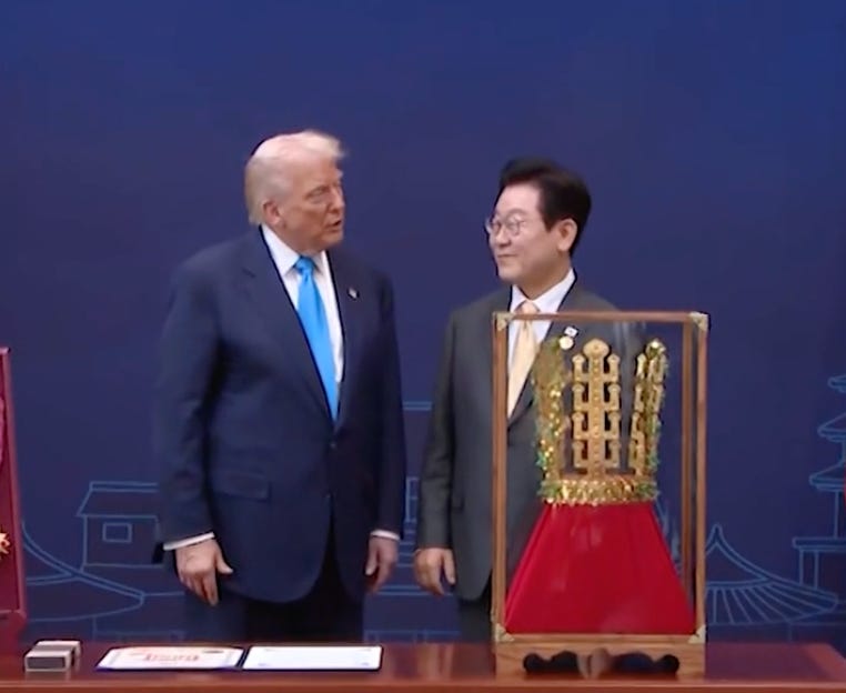 Trump then followed suit in answers to a question on Air Force One on his way to South Korea, where President Lee Jae Myung knew how to work Trump, feeding his ego by giving him a replica of a crown worn by Korean kings in 5th and 6th centuries. That, of course, deliciously fed into No Kings, as the gift mesmerized Trump, who even said he wanted to put it on “right now.”